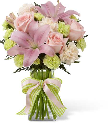 Our Girl Power Bouquet is an ideal way to celebrate the birth of a baby girl. This stunning arrangement features pink roses, pale peach carnations, and pink Asiatic lilies, accented with pale green mini carnations and lush greens. The bouquet is arranged in a clear, cubed square vase with a pink and green satin ribbon that perfectly matches the flowers. It is the perfect way to send your heartfelt wishes to the new parents and say Congratulations on your new baby girl!