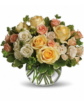 The Magic Moment bouquet is a breathtaking arrangement of flowers that symbolize the bond of friendship. Housed in a clear, circular vase, it makes the perfect gift to express your gratitude for your BFF's unwavering support and love. The bouquet is composed of bright yellow roses, representing care and happiness, as well as peach and white roses, symbolizing sincerity, gratitude, and purity. The greens used in the bouquet enhance the colors, giving it a magical touch that will brighten your friend's day.